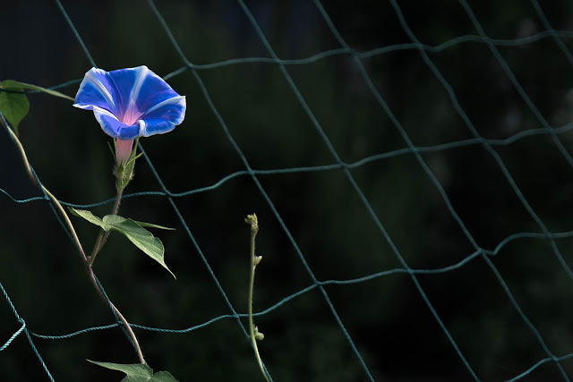 その建物の前に張られたネットに朝顔の蔓が巻き付き、青く上品な花を咲かせていました。