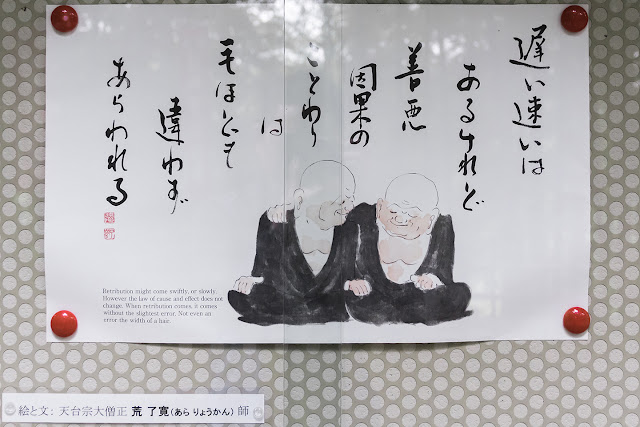 荒 了寛 ( あら りょうかん )さんという天台宗ハワイ開教総長の方が書かれたもので、書もイラストも言葉の内容も素晴らしくて、心の鍛錬を積んだ方はこれほどまでに多芸に秀でるものなのだなと感動してしまいます。