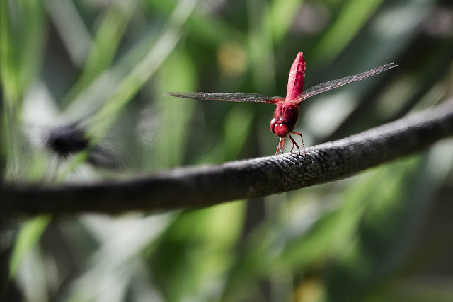 トンボたちはいつもは羽をハの字にして休んでいるのですが、赤とんぼが舞い降りた瞬間、まだ羽を水平に保ったままの力強い姿勢をとらえることができました。