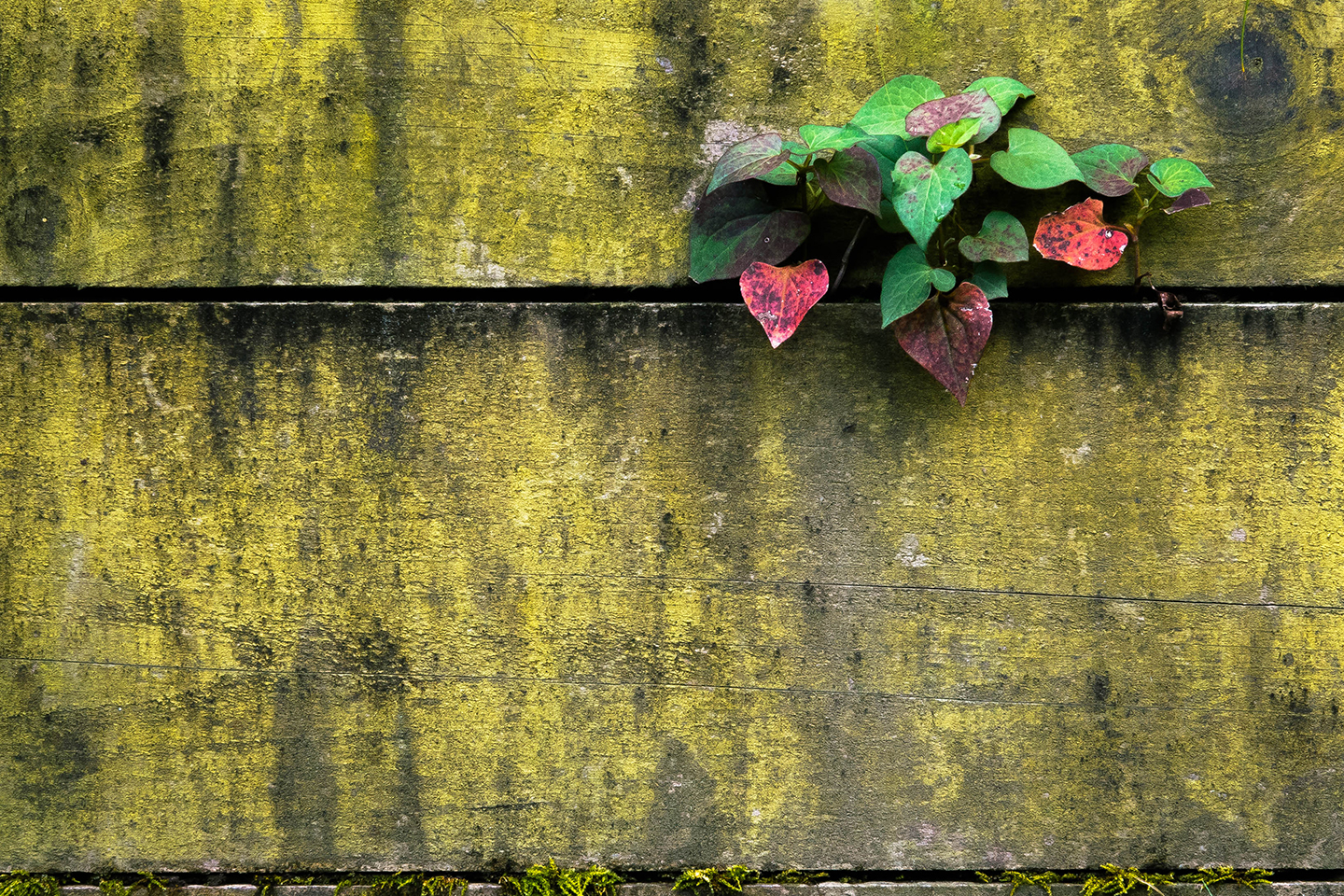 Posted on 2018年8月2日 by 今無庵 苔色の 壁に「いいね!」が 寄り添って 苔がうっすらと塗られた板の壁とハート形の葉っぱ 2018年7月撮影 使用カメラ:SONY DSC-RX10M3 F値:8.0 焦点距離:23.1mm シャッタースピード:1/80 ISO:200現像:Adobe Lightroom CC 以前も登場したことのある、薬師池公園のあじさい園の板の壁。 板の木目と隙間に生える葉っぱの配置バリエーションが豊富で、コンポジション心をくすぐります。 今回は黄緑の苔の色に染まった板の壁をベースに、密集したハートマークの葉っぱたちをアクセントにした構成で切り取ってみました。 撮影ポイント