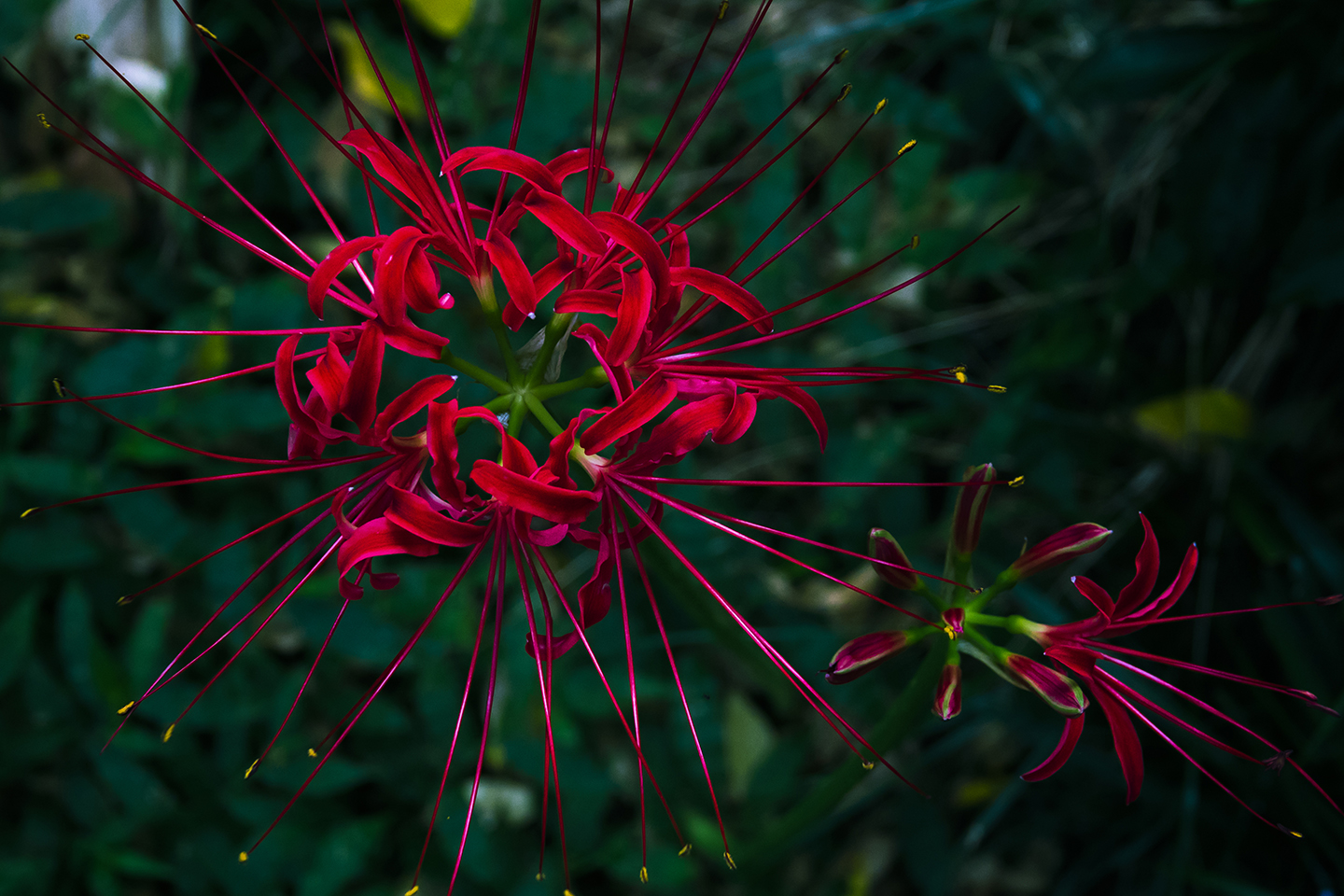 Posted on 2017年9月17日 by 今無庵 しっとりと 地に咲く秋の 花火かな 上から見た赤い曼殊沙華(ヒガンバナ) 2017年9月撮影 使用カメラ:SONY DSC-RX10M3 F値:3.2 焦点距離:18.9mm シャッタースピード:1/60 ISO:400 使用ソフト:Adobe Lightroom CC ヒガンバナの繊細でシャープな姿が、上から見ると夏空に上がる花火のようですね。