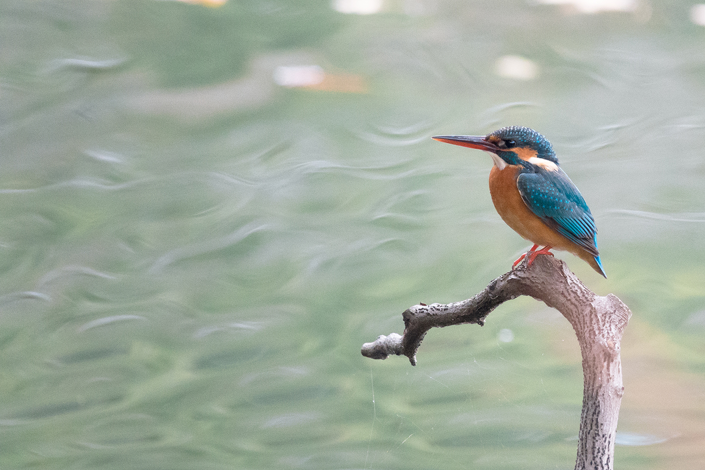これはその中のワンショットですが、背景の池の波紋がなんとも不思議な遠近感でカワセミの周りに浮遊しているように見えます。