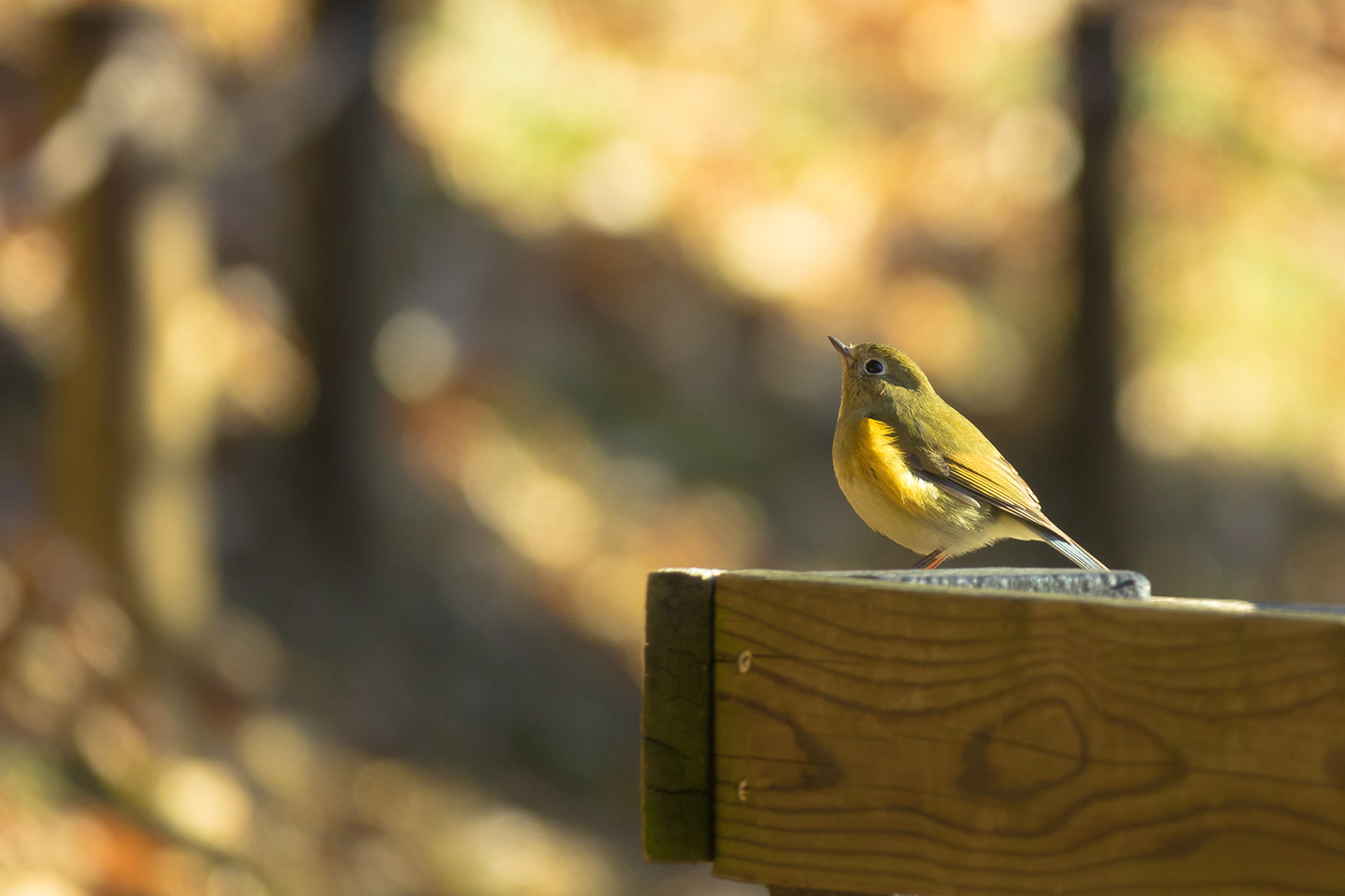 散歩道の手すりにとまるルリビタキのメス