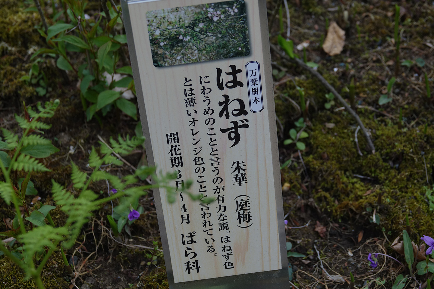 立札には「はねず 朱華(庭梅)」と書かれており、説明パートの二つの文は「…というのが有力な説」「…のことと言われている」とどちらもあいまいな感じに締めくくられています。
