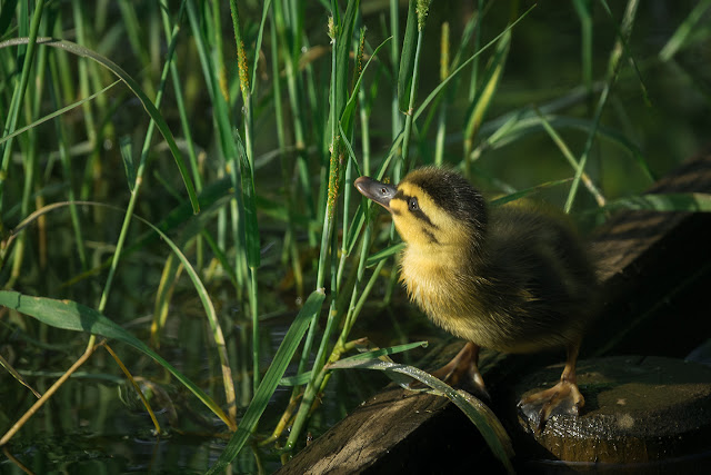 1羽の赤ちゃんが、ハス田のあぜ道の木の柵の上で、しばらく可愛いポーズを取ってくれました。