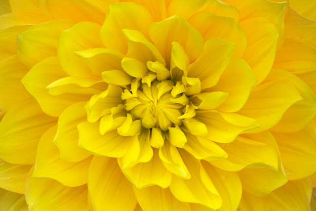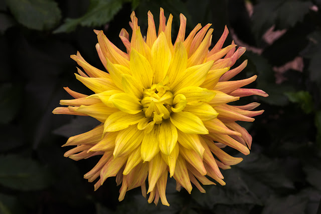 黄色とオレンジのダリア 燃え盛る太陽のよう |