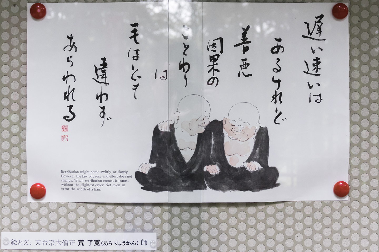 荒 了寛 ( あら りょうかん )さんという天台宗ハワイ開教総長の方が書かれたもので、書もイラストも言葉の内容も素晴らしくて、心の鍛錬を積んだ方はこれほどまでに多芸に秀でるものなのだなと感動してしまいます。