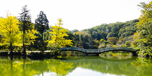 さて、写真は薬師池のシンボル「たいこ橋」とその辺りに立つ銀杏の木々です。
