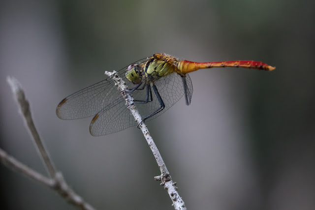 | 小さい赤紫の花とアキアカネ このような不安定な場所にトンボが止まるのは珍しい |