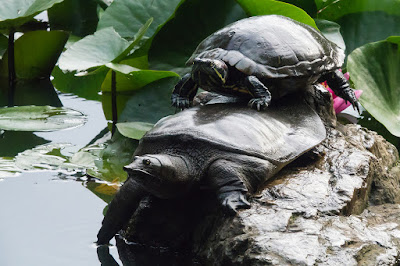 岩の上で睡蓮の花を眺めるスッポン ほとんど岩と同化していたので、見つけたときはびっくりしました |